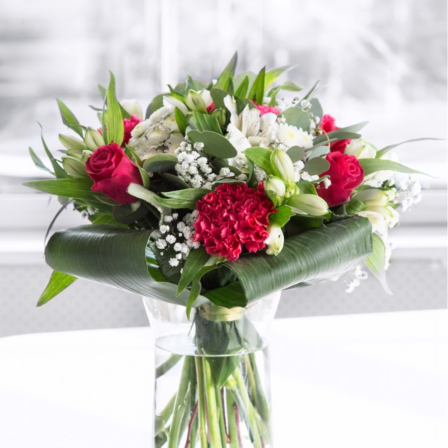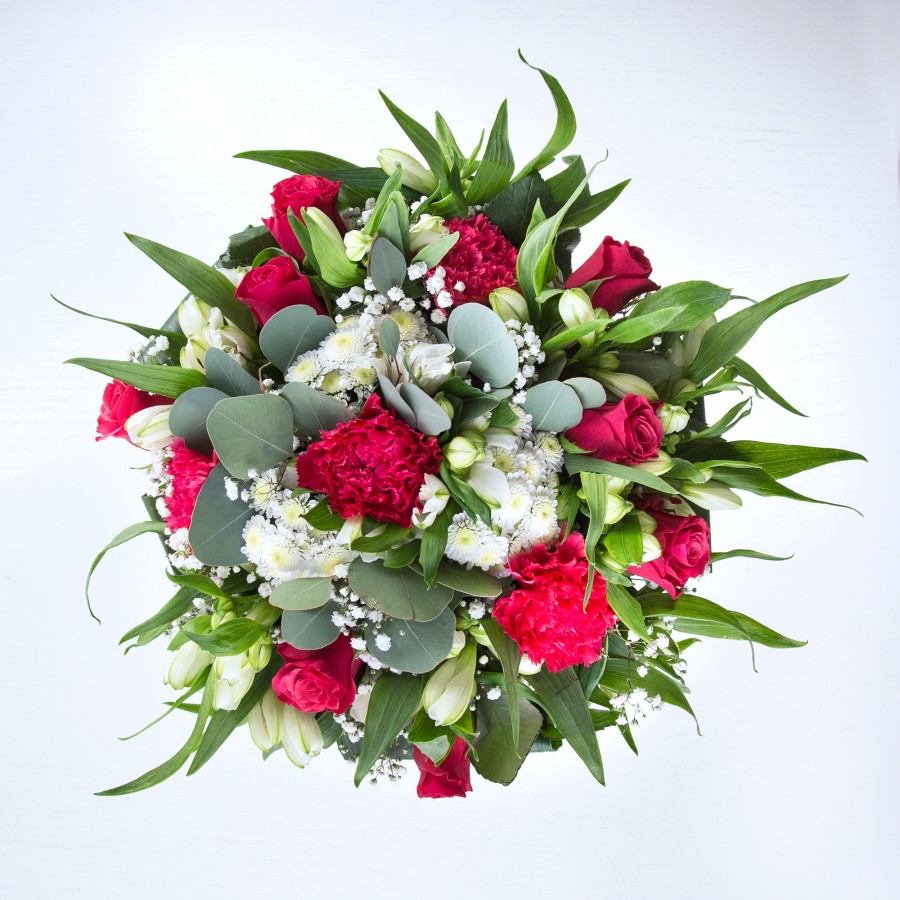 Celebrate beauty and uniqueness with our captivating bouquet, combining vibrant red roses and carnations with sweet white chrysanthemums and gypsophila. The sophisticated arrangement is finished with white alstroemeria and aspidistra leaves, showcasing an impeccable design.