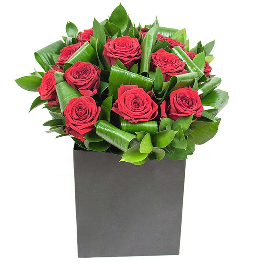 Our sophisticated bouquet features deep red roses, vibrant aspidistra leaves, and graceful ruscus. This unique design adds a touch of elegance to any home.